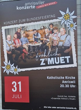 | 31. | 20.30 - 21.45 | Katholische Kirche 8580 Amriswil, TG | Ensemble "Fröhlich z`muet" -Ruth Felix -Thomas Gmünder -Ernst Gmünder -Fabio Singer -Karl Svec -Thomas Haubrich -Oliver Büchi -Walter Müggler -Hanspeter Schmid -Johannes Schubert -Trachtentanzgruppe Thurgau | "Schweizerisches und Klassisches" In bewährter Manier und in immer neuen ungewohnten und spannenden Zusammensetzungen bietet das Ensemble "Fröhlich z`muet" gediegene Klassik, lüpfige Volks- und Marschmusik, freche Töne- aber auch Traditionelles. Eintritt frei - Kollekte ![]() | |||||